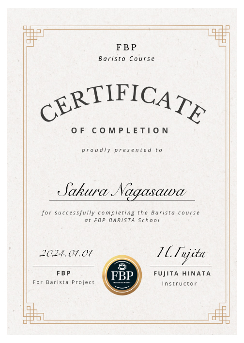 FBPバリスタ教室では、あなたの学びをより良く、より深くするための「FBPノート」を最初の授業でお渡ししています。授業の中で難しく感じたところや、さらなる疑問などをメモしておくと、先生がそれを見てあなたに合わせたフィードバックを行います。ノートの最後は修了証(サンプル)になっています。修了証を目指して一緒にがんばりましょう。